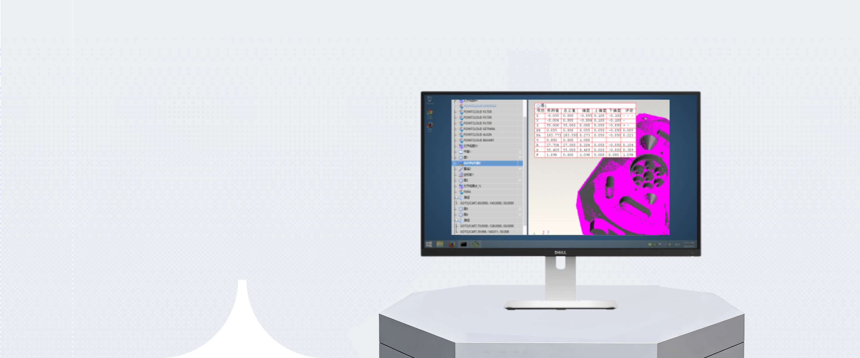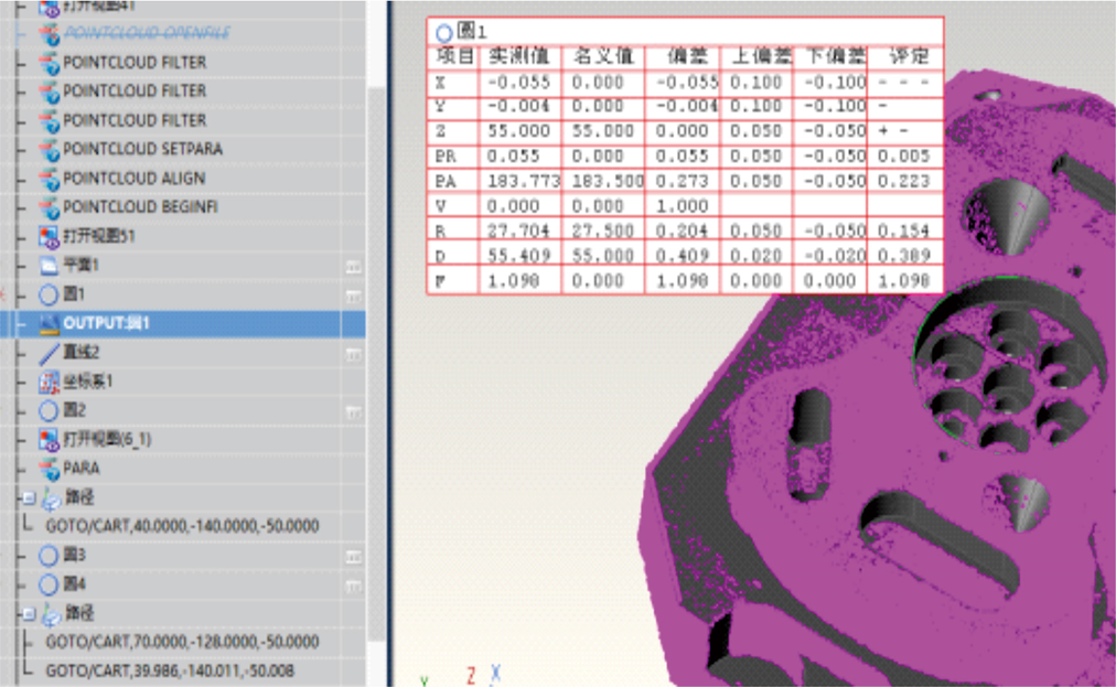 可连接各种线激光、3D相机,实现点云数据采集、显示、编辑,点云数据和CAD模型匹配,并可通过特征、曲面点和边缘点构建坐标系对齐方式;从点云、三角化特征或探测点中提取测量特征,通过点云数据创建截面线,生成色差图进行误差分析等功能。